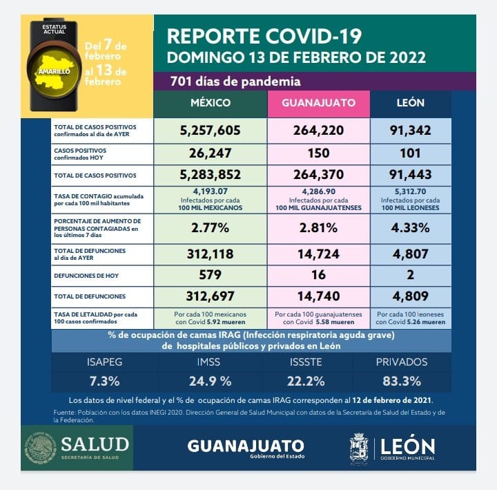 En esta semana del 7 al 12 de febrero en león Guanajuato se han confirmado 17 muertes y 2,916 nuevos contagios de Covid-19, en esta semana el semáforo permaneció en amarillo.