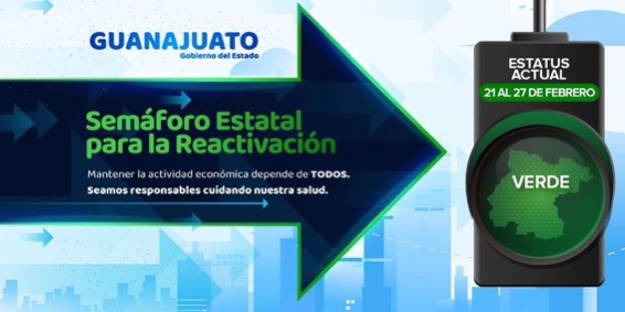 El estado de Guanajuato cambia a color verde en el semáforo de reactivación económica a partir del 21 y hasta el 27 de febrero del 2022, así lo anunció la jefa Estatal de Epidemiología, la Doctora. Fátima Melchor Márquez, esto en representación del Doctor. Daniel Díaz Martínez, secretario de salud del Estado.
